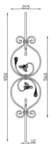 Barreau ornemental avec motif central, panneau décoratif, en fer forgé. Hauteur 950mm Largeur 215mm carré lisse plein de 12mm, hauteur du décor 560mm. Fixation par soudure. Fourni brut, à peindre ou à vernir pour protéger de la corrosion. Au delà de son rôle sécuritaire, il peut être un élément décoratif dans plusieurs réalisations en fer forgé tel que du mobiliers, divers objets décoratifs, des grilles de défense, des rampes d'escaliers, des portails, des kiosques, des gardes corps.