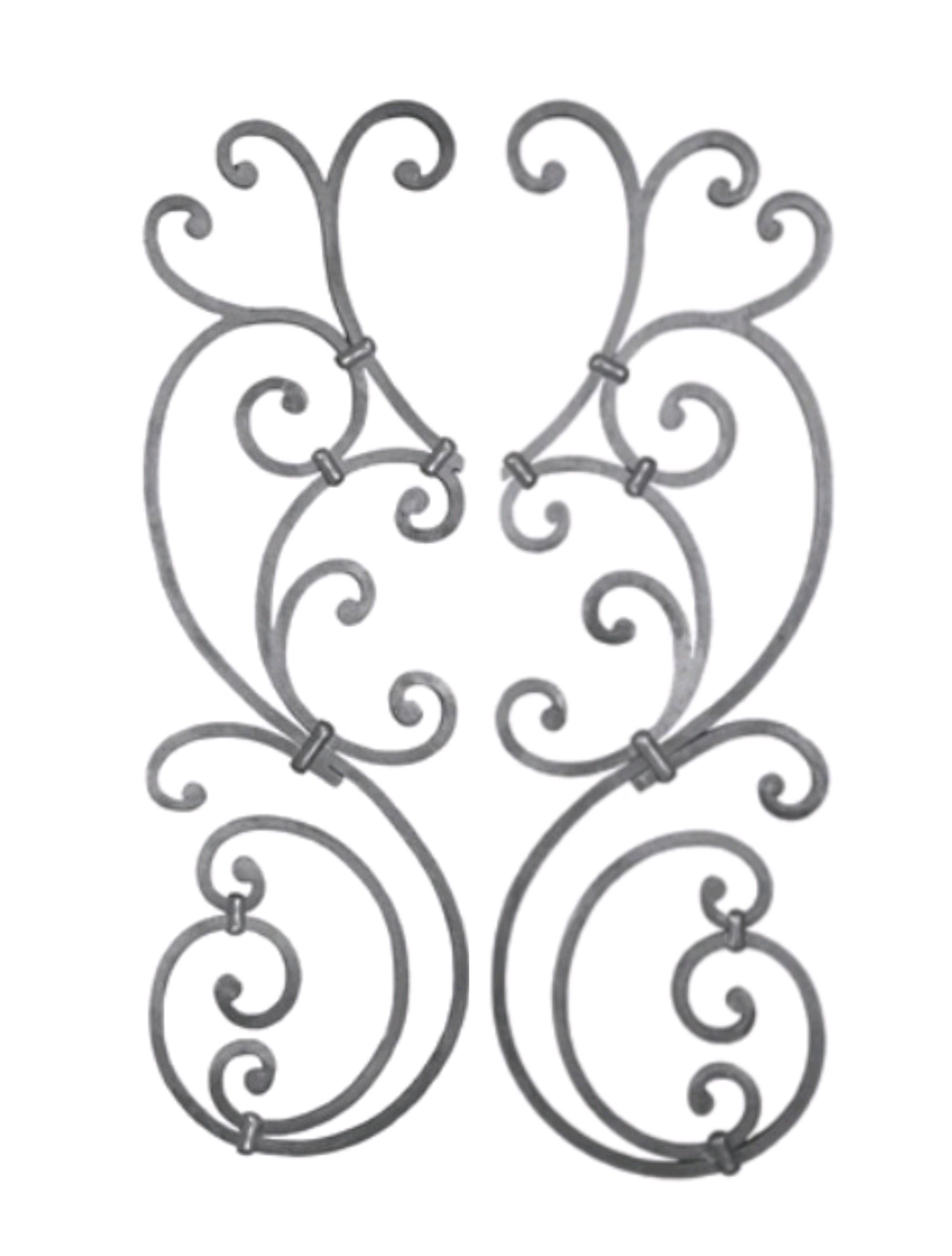 Décor côté droit composé de volutes, en fer forgé . Hauteur 810mm largeur 260mm. section en carré lisse de 12mm. Ce décor permet de fabriquer un appui de fenêtre ou décorer un portail, par exemple, dans le sens horizontal ou vertical. Fixation par soudure. Fourni brut, à peindre ou à vernir avec un produit adapté qui permet de le protéger contre la corrosion.