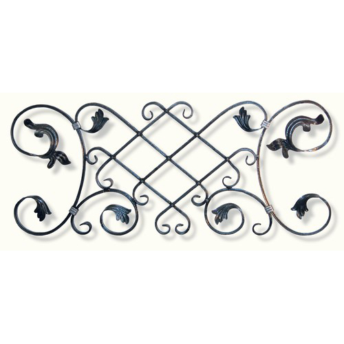 Panneau décoratif composé de nombreuses volutes en C aux finitions feuilles, en fer forgé lisse grenaillé. Hauteur 370mm et Largeur 880mm avec profilé en fer plat lisse de 16x8mm. Ce panneau décoratif peut être présenté à l'horizontale, son utilisation est multiple: balcon, terrasse, fenêtre, balustrade... Fixation par soudure. Fourni brute, à peindre ou à vernir pour le protéger de la corrosion. Utilisation intérieure ou extérieure.
