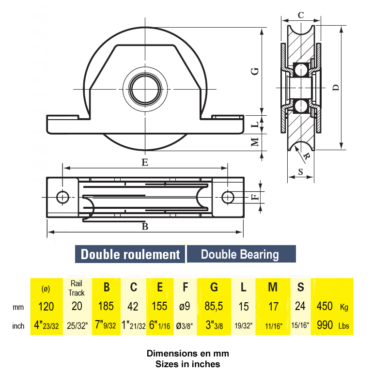 Diamètre de 120mm. Diamètre de 120mm. Peut supporter jusqu'à 450KG de charge. Peut supporter jusqu'à 450KG de charge. Peut supporter jusqu'à 450KG de charge. Longueur de 185mm. Largeur de 42mm.