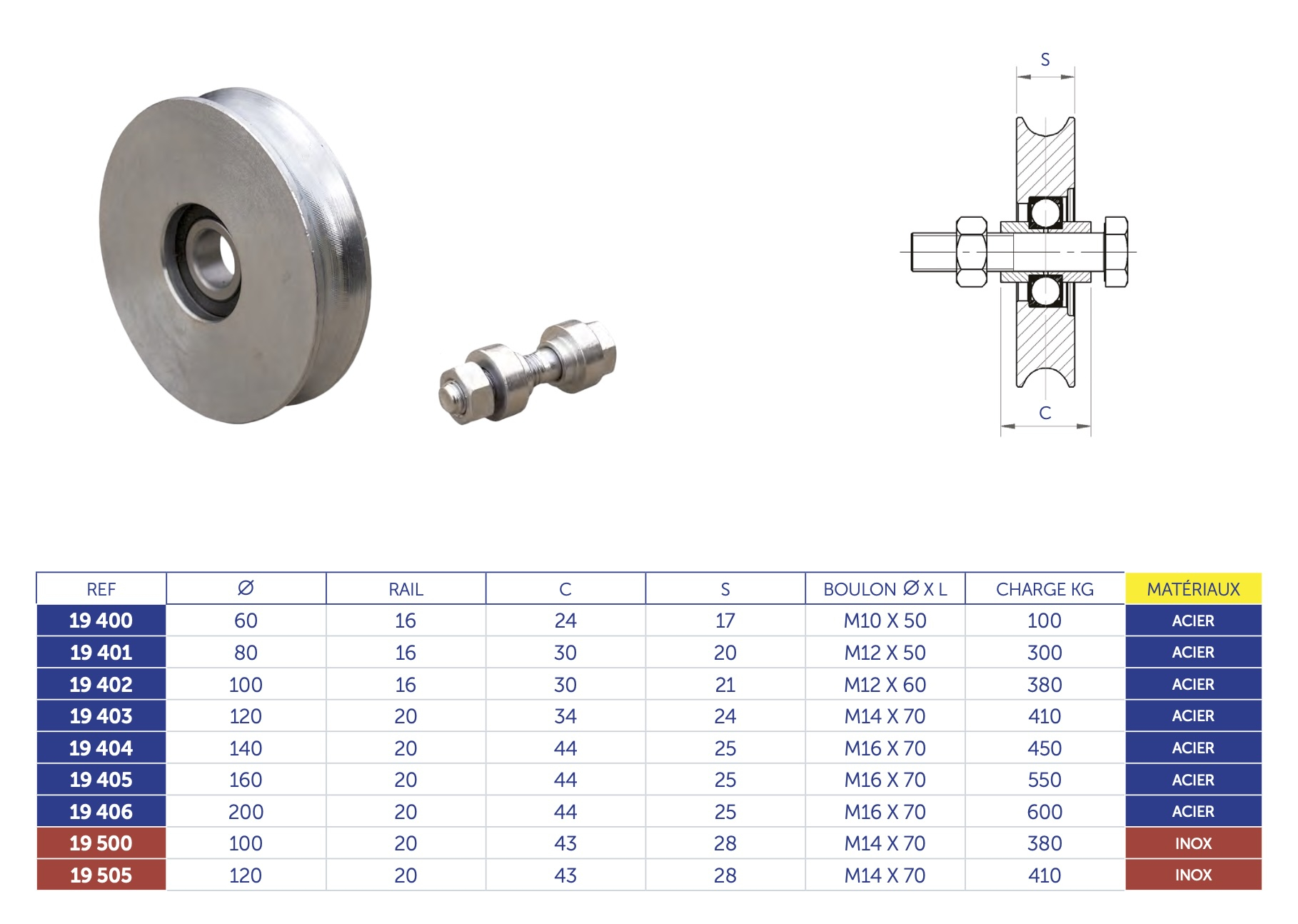 Roue à gorge ronde de diamètre 160mm. Vendue avec son axe de fixation. Charge maximum 550kg. Compatible avec le rail 19193.