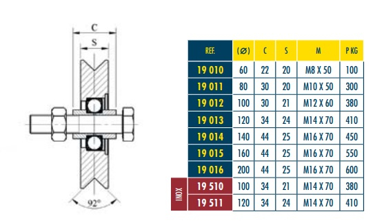 Roue à gorge en V de diamètre 100mm. Vendue avec son axe de fixation. Charge maximum 380kg.