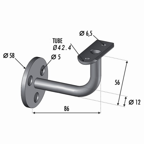 Support mural de main courante ronde, fixe de 90 degrés. Longueur 86mm Hauteur 56mm, platine ronde de diamètre 58mm, compatible avec des tubes de diamètre extérieur de 42,4mm en inox ou en bois. En inox 304. À visser au mur grâce à 3 trous de diamètre 5mm, et à visser à la main courante grâce à 2 trous de diamètre 6,5mm (visserie non fournie). Permet d'être utilisé en intérieur comme en extérieur et même en bord de mer. Existe en version inox 316 ( ref 3010016) et en version réglable (ref 30120).