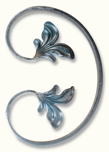Volute en C finition feuilles, en fer forgé. Hauteur 205mm Largeur 150mm section en fer plat de 12x6mm. Fixation par soudure. Permet de décorer votre fabrication en fer forgé, portail, clôture, pergola, mais également permet de renforcer la sécurité, en diminuant le vide entre barreau, ou d'augmenter le soutien. Fourni brut, à peindre ou à vernir pour protéger contre la corrosion. Peut être présentée à l'horizontal ou à la vertical.