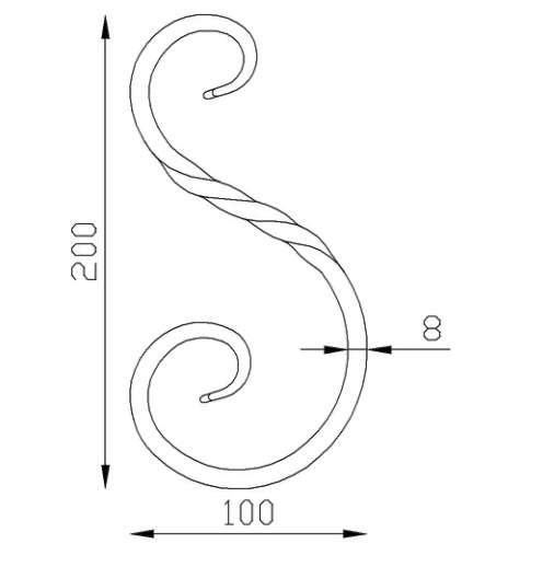 Volute en S inégale, avec une torsade au centre, finition queue de carpe, en fer forgé. Hauteur 200mm largeur 100mm en carré de largeur 8mm. Fixation par soudure. Permet de décorer votre fabrication en fer forgé, portail, clôture, pergola, mais également permet de renforcer la sécurité, en diminuant le vide entre barreau, ou d'augmenter le soutien. Fourni brut, à peindre ou à vernir pour protéger contre la corrosion.